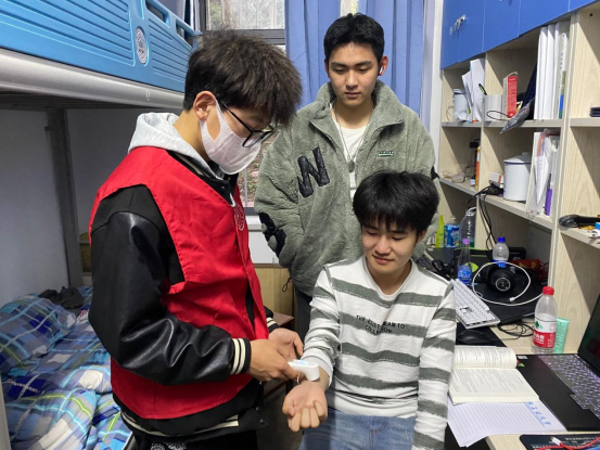 守好一个门,护好一校人。自学校实行封闭管理以来,从食堂到宿舍,从核酸采样点到学院办公楼,身着“红马甲”的能环党员志愿者们便开始活跃在校园的各个角落。能环学院青协卢鸿儒同学在学生里招募志愿者时说道:“疫情期间,校园防护需要每一位同学共同努力!”学院把党员先锋示范岗设立在办公楼下,严格落实体温检测、消毒杀菌的进入措施,成为了学生党员踊跃报名的新“焦点”。