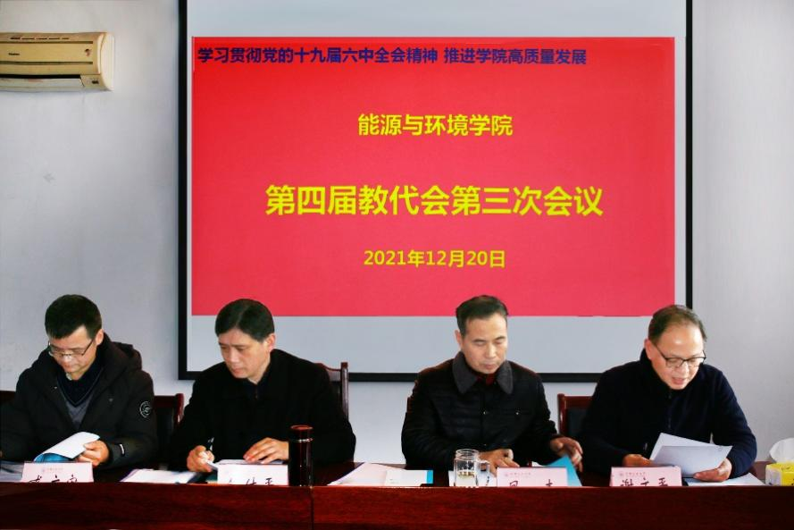 2021年12月21日下午,能源与环境学院四届三次教代会在能源楼325召开。大会主题“学习贯彻党的十九届六中全会精神 推进学院高质量发展”。大会由学院党委副书记、副院长谢文平主持。