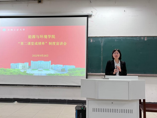 为使2022级新生全面了解“第二课堂成绩单”制度,推进制度深入实施,2022年9月28日晚,能源与环境学院于教三南103召开“第二课堂成绩单”制度宣讲会,能源与环境学院团委书记钱春梅主讲,能环学院全体新生聆听了此次宣讲。