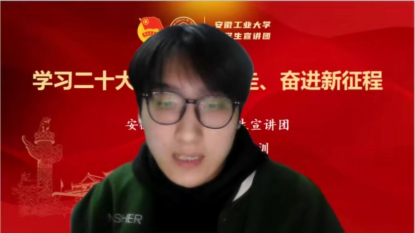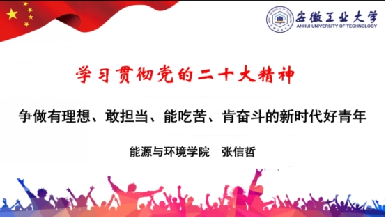 2月27日19时,能源与环境学院于线上开展开展“学习贯彻落实党的二十大精神”宣讲活动。2019级辅导员钱春梅、能源与环境学院2019级全体学生参加了本次活动。由院宣讲团成员张信哲进行宣讲。本次宣讲主要以争做有理想、敢担当、能吃苦、肯奋斗的新时代好青年为着力点,带领同学们学习了二十大精神的核心要义,感悟了二十大精神的深刻内涵。