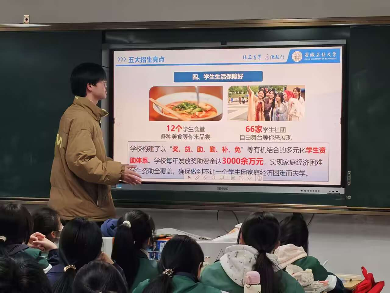 宣讲期间,队员们以“学长学姐”身份,化身工大“形象代言人”,通过“走进安工大”“办学实力”“招生亮点”“报考建议”等多个模块,系统展示安徽工业大学的区位优势、学科实力、师资力量、校园文化及就业前景。围绕能源与环境学院特色专业,队员们结合国家“双碳”战略背景,详细介绍专业课程体系、就业方向及行业发展趋势,帮助学弟学妹直观感知绿色发展领域的广阔前景。