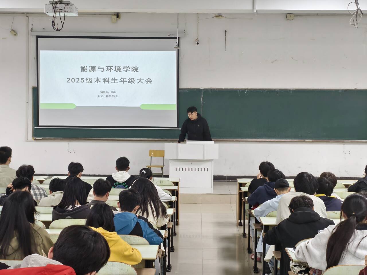 为进一步加强学生教育管理,筑牢安全防线,强化学风建设,引导2025级本科生合理规划大学生活,4月12日晚,能源与环境学院2025级本科生年级大会在教三203教室顺利召开。本次大会由年级辅导员赵杨主持,全体 2025 级本科生参会。