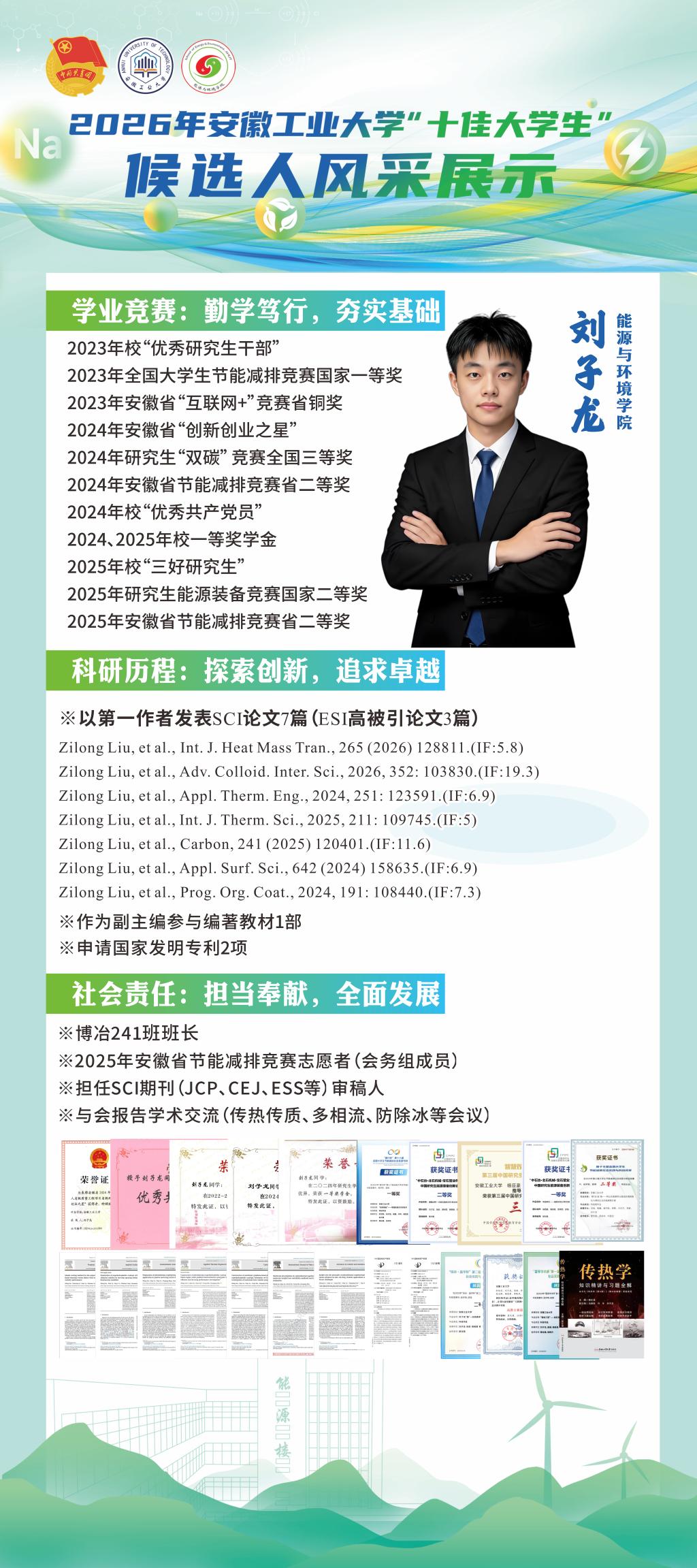 研途奋进,深耕不辍。研究生刘子龙同学是勇攀科研高峰的创新先锋,也是担当奉献的学生骨干。他聚焦专业前沿,围绕国家能源安全重大战略需求,深耕光热超疏水涂层防和防冰除冰等研究方向,始终保持对科研的敬畏与热爱,潜心钻研、刻苦攻关,以第一作者在Advances in Colloid and Interface Science、International Journal of Heat and Mass Transfer等顶级期刊发表7篇SCI论文。带领团队在节能减排、研究生创新实践等科创竞赛中获国家级/省级奖项10余项。个人获评安徽省“创新创业之星”、校“优秀共产党员”等称号,用实际行动诠释了新时代研究生将个人理想融入国家发展的卓越追求与先锋本色。