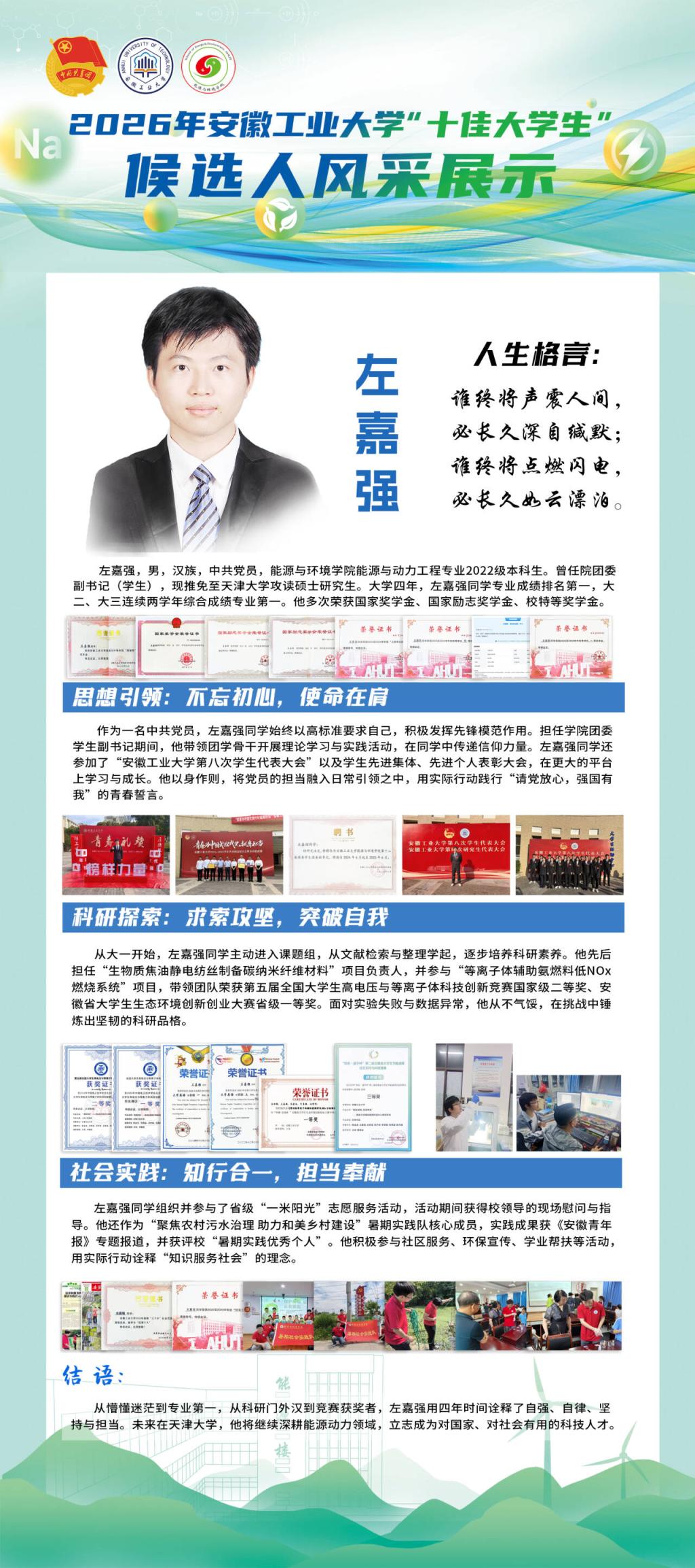 青春逐梦,笃行致远。作为本科生代表,左嘉强同学以专业第一的成绩推免至天津大学,曾获省优秀毕业生、国家奖学金等多项荣誉。曾任院团委学生副书记,组织开展团学工作,投身社会实践和志愿服务活动,获《安徽青年报》专题报道,用奉献传递温暖,在青春路上砥砺前行。在科研实践中,他主动参与国家级、省级科研项目,扎根实验室深耕细研,在污染治理、能源高效利用等相关领域积累了宝贵经验,先后在学科竞赛中斩获国家级、省级多项奖项,用创新思维破解专业难题,展现了新时代本科生的钻研精神与责任担当。